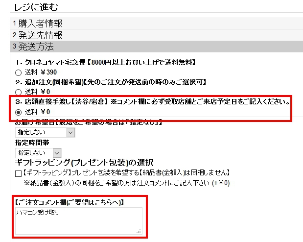 ご注文時に「店舗受け取り」を選択し、コメント欄に「ハマコン受け取り希望」とご記入ください。