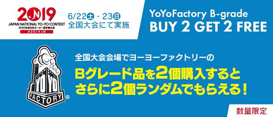 5月に大好評いただきましたヨーヨーファクトリーBグレードセール。今回ブースでもBグレードを販売!そして「1回の会計でYYFのBグレード品を2個購入ごとに、Bグレード品2個ずつついてくる」キャンペーンを開催します!2個購入でおまけが2個!4個購入でおまけは4個です!おまけになるヨーヨーは諸事情やレア過ぎて商品として出せなかったものなども含まれます。