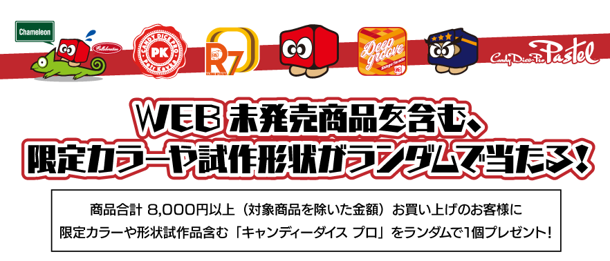 商品合計8,000円以上(対象商品を除いた金額)お買い上げのお客様にWEB未発売商品を含む、限定カラーや試作形状の「キャンディーダイス プロ」をランダムで1個プレゼント!