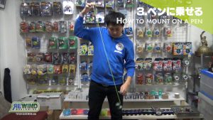 ヨーヨーをナナメに投げて、ヨーヨーの側面(サイドフェイス)にペンを立てます。なれないうちはヨーヨーを跳ね上げて乗せるのではなく、ペンで迎えに行きます。