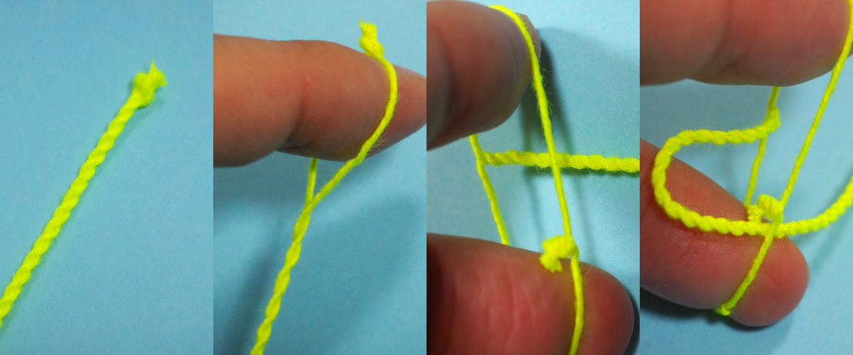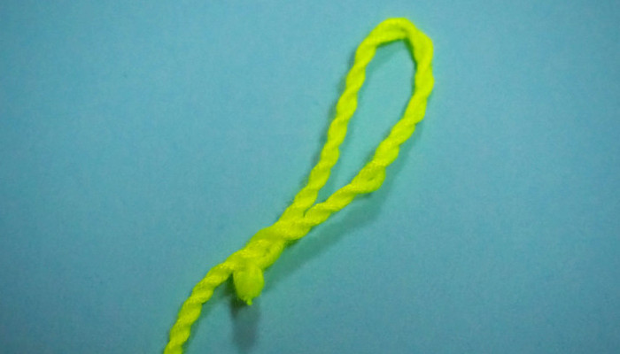 ①フィンガーホールを作る方のストリングの先端を方結びする。