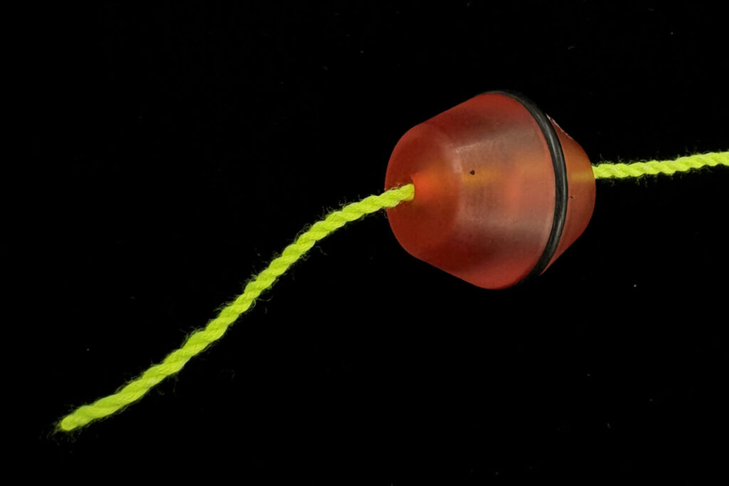 【写真7】最後まで引っぱると、このようになります。念のため、もう一度軽く引っぱって、ダイスからストリングが取れないか確認しておきましょう。あとはヨーヨーにストリングを取り付けます。