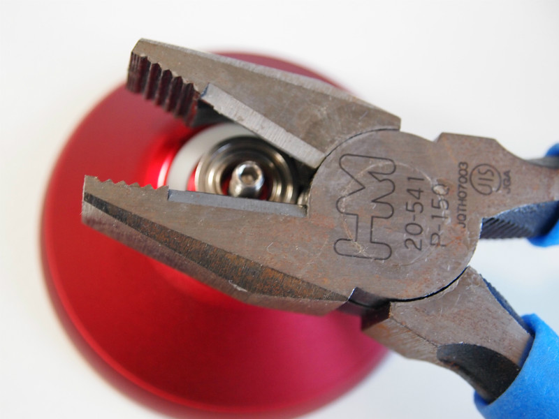 ペンチの穴でベアリングをはさみます。思いっきり握るとベアリングが壊れてしまうので、注意しましょう。