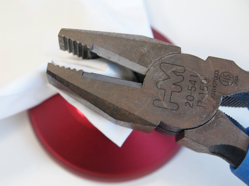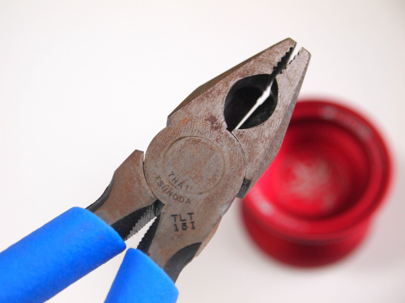 【写真1】ベアリングはずしの時、ペンチはここを使う。つまり新しくペンチを買うときには、この穴にベアリングがちゃんとはまるかどうかを注意すること。