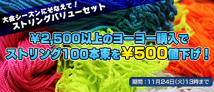 『2500円以上のヨーヨーと一緒に対象のストリング(100本束)を買うと1束毎に500円オフ!』