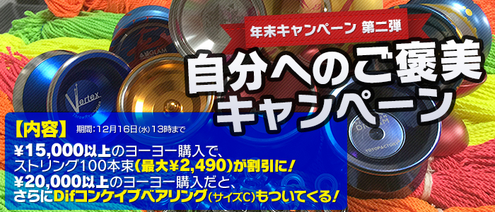 高額なヨーヨーを購入すると、ストリング100本束が無料になり、Difコンケイブベアリング(サイズC)がおまけについてくるキャンペーンを開催しています。