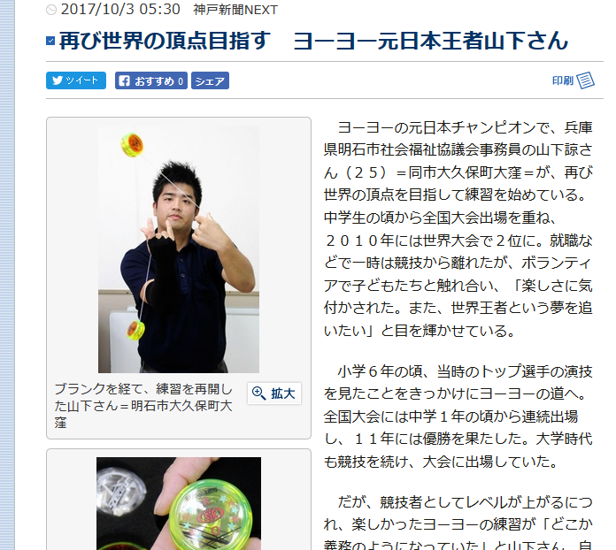 神戸新聞 再び世界の頂点目指す ヨーヨー元日本王者山下さん