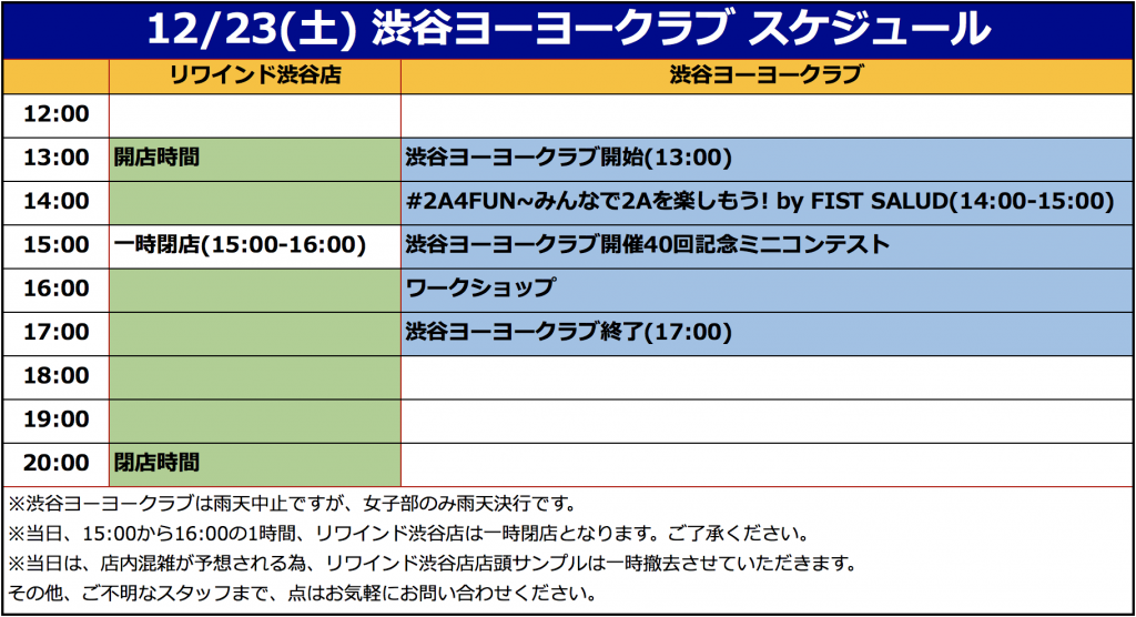※ヨーヨークラブ当日、15:00〜16:00の1時間、リワインド渋谷店は一時閉店となりますので、ご注意ください。また、本記事の最後に注意事項等もありますので、ご参加される方は、そちらもご確認ください。