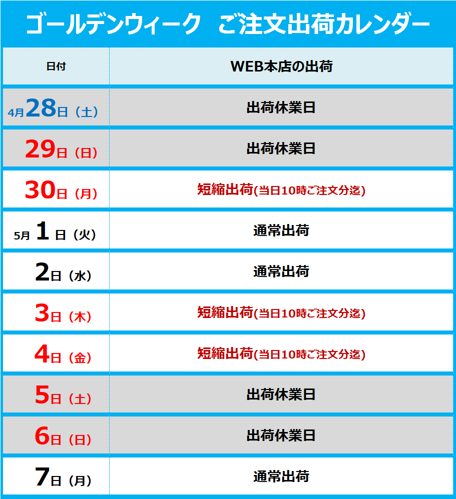 ゴールデンウィーク中の出荷について 2018 4/27 ストアブログ 2018年4月27日 ゴールデンウィーク中のWEB本店の出荷カレンダーになります。 ※短縮出荷日は当日10時までのご注文(コンビニ払い・銀行振込は10時迄のご入金)を当日出荷させて頂きます。 ストアブログ この記事が気に入ったら いいね または フォローしてね! Follow @rewindyoyo Follow Me よかったらシェアしてね! URLをコピーしました! URLをコピーしました! ヨーヨーファクトリー新作バイメタル「マルコ」5月1日発売 5月13日(日)第94回いわくらヨーヨー練習会 / JYYF検定 / JTチャレンジ この記事を書いた人 REWIND Staff 関連記事 2025/10/23(木) – 週刊リワインド:C3ビデオコンテスト結果発表!新商品はカリブーロッジ・ラフトヴァーク・ヨーヨーフレンズ・シュトルムパンツァー・JT・C3・UNPRLDから入荷!! 2025年10月23日 2024年コロラド州大会のフリースタイル動画 2025年10月19日 C3ビデオコンテスト2025 結果 2025年10月17日 2025/10/16(木) – 週刊リワインド:C3ビデオコンテスト明日の配信で結果発表!新商品はJT・ディスヨーヨー・TP等から入荷!! 2025年10月16日 2025 PNWR(パシフィックノースウェストリジョナル)決勝のフリースタイル動画 2025年10月15日 【10/14(火)19時~生配信】寺田真悟誕生日会「酔う酔うナイト in 愛知岩倉」愛知に移住しました&デッドストック放出します!! 2025年10月12日 2025/10/9(木) – 週刊リワインド:渋谷店でワンスロー開催!新商品はアトモス・C3・ディスヨーヨー・ヨーヨーオフィサーから入荷!! 2025年10月9日 2025/10/2(木) – 週刊リワインド:C3ビデオコンテスト選考中!新商品はカリブーロッジ・ハイパーヨーヨーアクセル・ヨーヨーフレンズから入荷!! 2025年10月2日