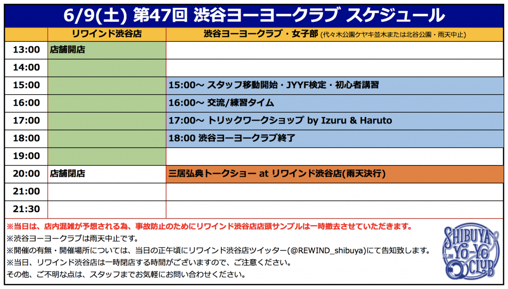 2週連続となりますが、今週6/9(土)も渋谷ヨーヨークラブも開催!今回はいつもと開催する時間帯が違いますので、ご注意ください。
