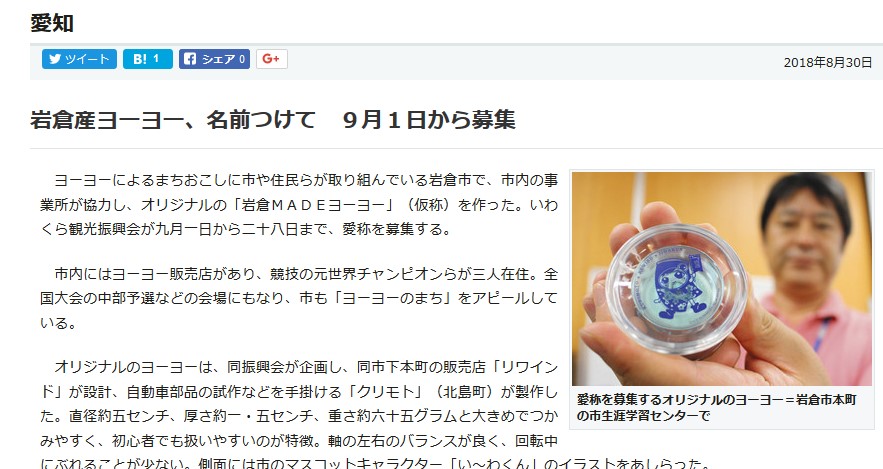 中日新聞の方では、今回使用した岩倉MADEヨーヨーの名前の公募についてもふれられています。