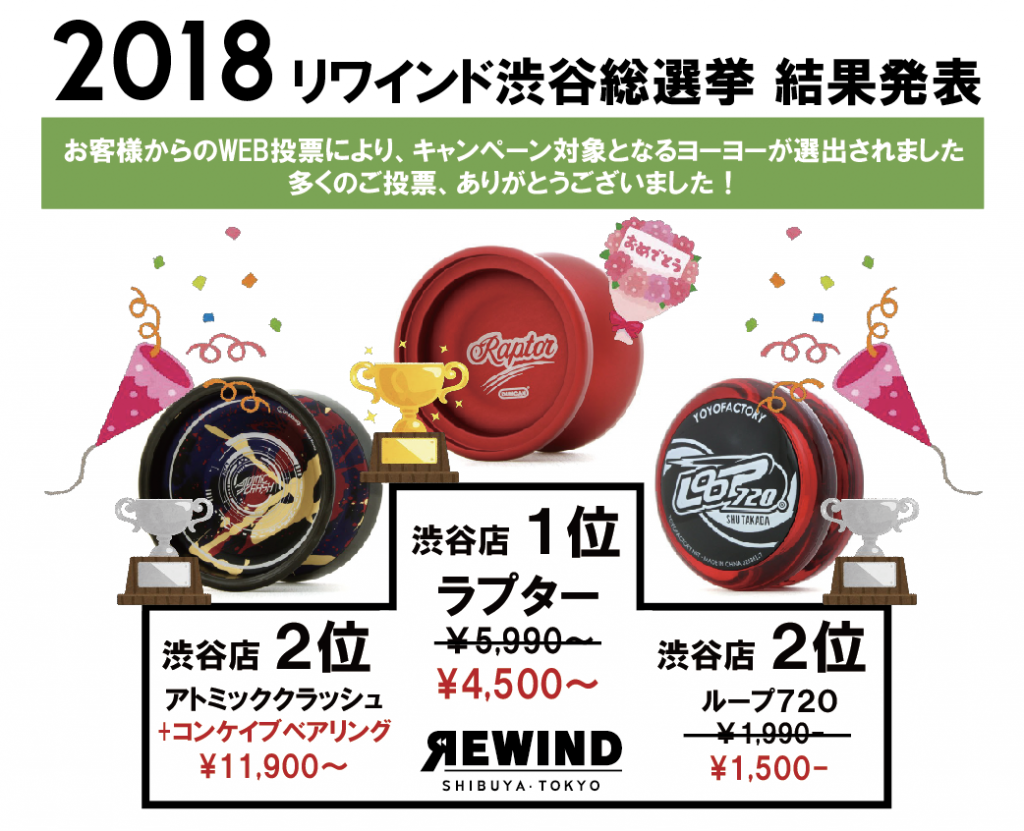 12月の恒例イベント、リワインド総選挙。昨年に引き続き、渋谷店は独自に総選挙を開催、結果、Duncan「ラプター」が1位を獲得。ほんとうに、ありがとうございます。。。
