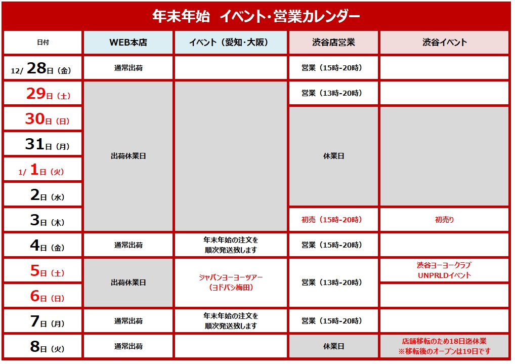 年末年始の営業スケジュールをお知らせします。お客さまにはご不便をおかけしますが、ご確認のほどよろしくお願いします。