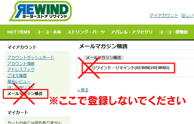 リワインドでマイアカウント上に「メールマガジンに登録する」というチェックボタンがありますが、そちらは既に使用されていない古いメールマガジンシステムへの登録になります。