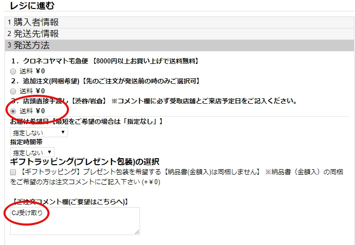 ご注文時に「店舗受け取り」を選択し、コメント欄に「CJ受け取り希望」とご記入ください。