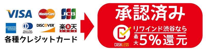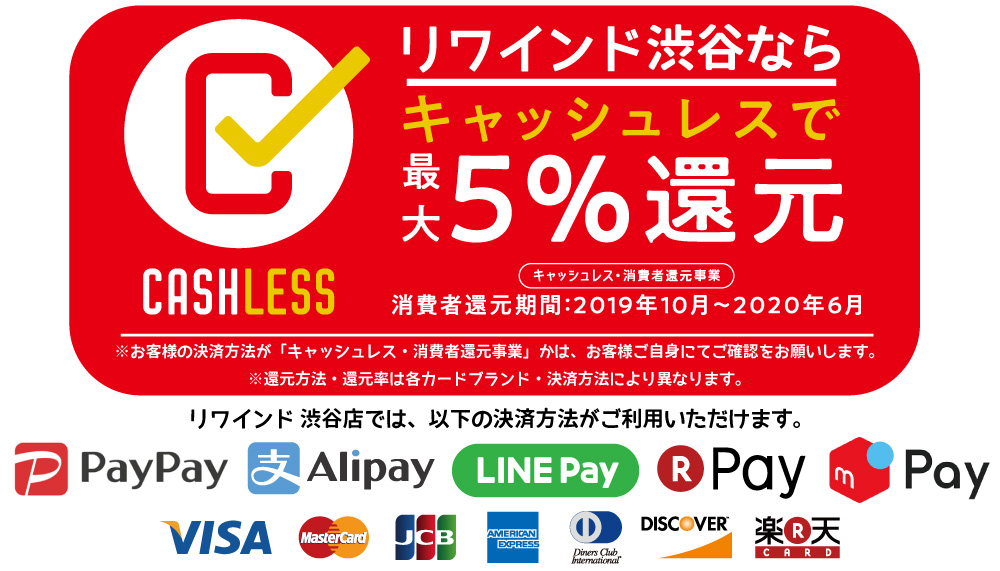 いつもリワインド渋谷店をご利用くださり、誠にありがとうございます。このページでは、東京都渋谷区にあるリワインド渋谷店(実店舗)の「キャッシュレス・消費者還元事業」対応状況をお知らせしております。還元事業に関する詳細は、以下の一般社団法人キャッシュレス推進協議会が運営するサイトをご確認ください。