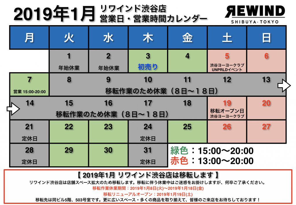すでにリワインドTVやブログ記事でお伝えしている通り、リワインド渋谷店は、2019年1月中旬に店舗拡大のため、移転することとなりました。これもひとえに、日頃からご愛顧くださるお客様・応援してくださる皆様のおかげです。本当にありがとうございます。