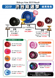 リワインドそして渋谷店の年末恒例イベント総選挙!今年も渋谷店は独自に「渋谷総選挙」と題して皆様の今年一番オススメなヨーヨーをご投票いただきました。今回の総選挙では、渋谷店では3位までの機種にプラスして、WEB本店入賞商品・投票のあったスタッフモデルに、特別枠ユタカ大プッシュアイテムをセール対象にします!