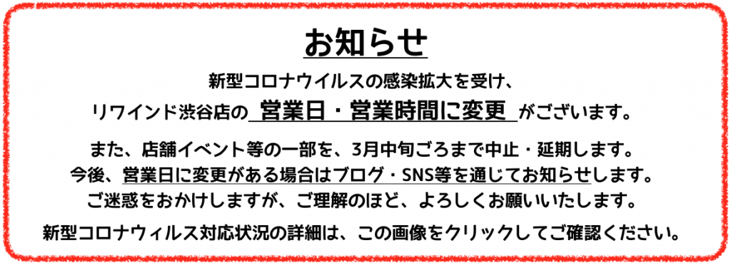 渋谷店の新型コロナウイルス関連の対応につきましては、以下のブログ記事をご確認ください。また、店舗にて感染症予防対策を行なっております。ご来店くださいますお客様につきましても、マスクの着用や咳エチケットなど、ご協力をお願いいたします。