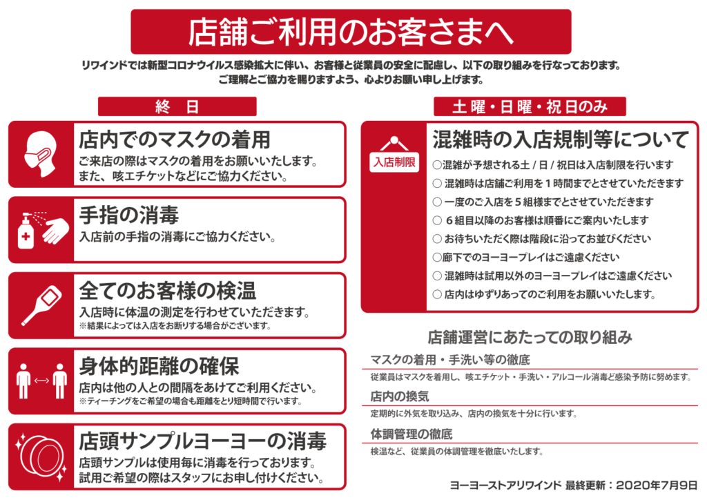また、店舗では以下の通り、感染予防対策を行なっております。特に週末・祝日は入店制限を行わせていただきます。お客様へはご迷惑をおかけしますが、ご理解とご協力をお願いします。