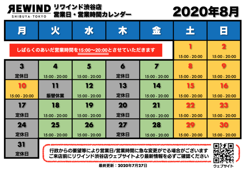 リワインド渋谷店 8月の営業日等について