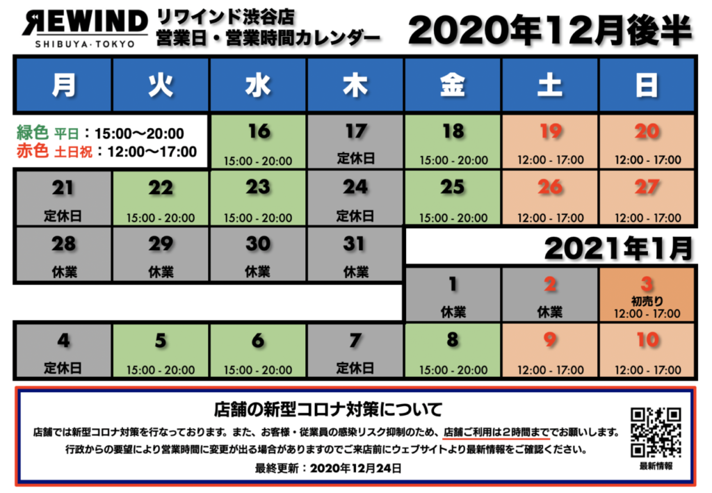 リワインド渋谷店 年末年始の営業日について