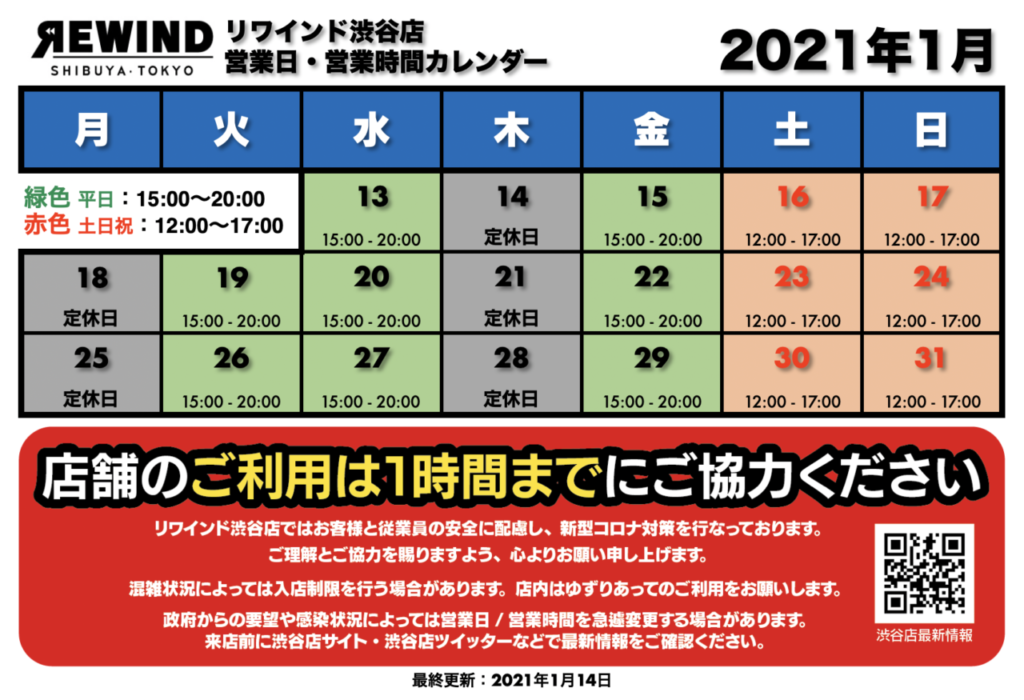 リワインド渋谷店、2021年1月後半の営業日カレンダーは上記の通りとなっております。引き続き、店舗では新型コロナ対策を行なっております。店舗のご利用はしばらくの間《1時間まで》にご協力をお願いします。なお、行政からの要望や感染状況によっては営業時/営業時間を急遽変更する場合があります。店舗のコロナ対策・最新情報は以下のページをご確認ください。