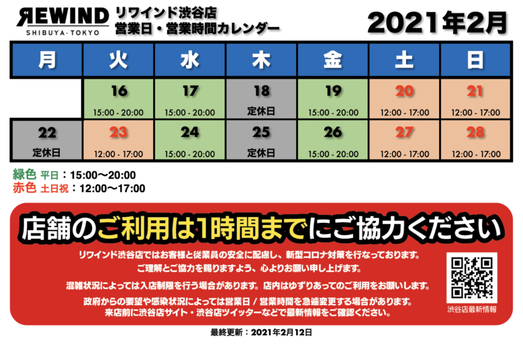 リワインド渋谷店 2021年2月後半の営業日カレンダー