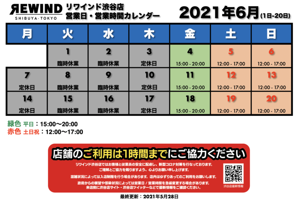 リワインド渋谷店、6月も引き続き、営業日を縮小しております。引き続き、まだまだおうち時間の多い今、より多くの方に楽しんでいただくコンテンツ配信等に注力してまいります。特にここから1週間あまりは渋谷からの配信が盛り沢山です。配信そして、各プロダクトを是非チェックしてください!