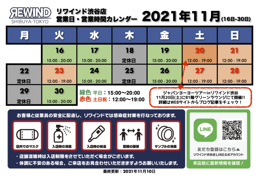 リワインド渋谷店、11月後半の営業日カレンダーを公開いたしました。11月後半より店舗利用時間制限の緩和ならびに、土日祝日の営業時間の延長を行います。詳しくは、上記カレンダーをご確認ください。
