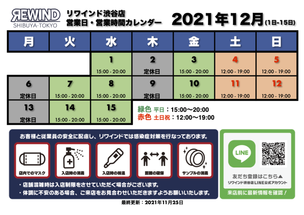 リワインド渋谷店、12月前半の営業日カレンダーは上記のとおりです。店舗ではマスク着用や、入店時の消毒・検温など、新型コロナ対策を継続し、今後もお客さま、従業員の安心安全を第一に考えて営業してまいります。ご理解、ご協力を賜りますよう、 心よりお願い申し上げます。