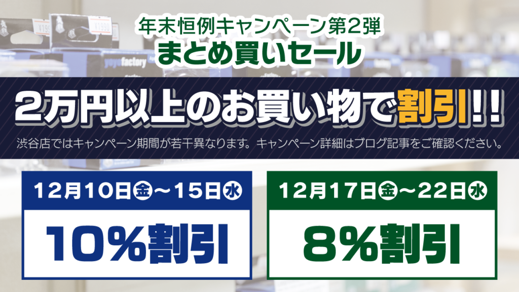 キャンペーンは二段階。渋谷店では、2万円以上購入時に、12月15日(水)までが10%OFF、12月17日(金)~22日(水)までは8%OFFになります!