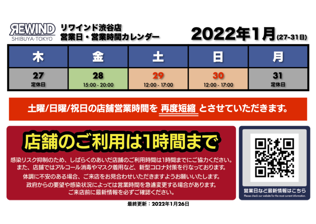 リワインド渋谷店では、1月末より土日祝日の営業時間を《12:00〜17:00》に短縮させていただくことになりました。また、店舗をご利用くださるお客様へ、しばらくのあいだ、感染リスク抑制のため店舗のご利用は1時間まで、を再びお願いしております。ご理解・ご協力のほど、よろしくお願い申し上げます。
