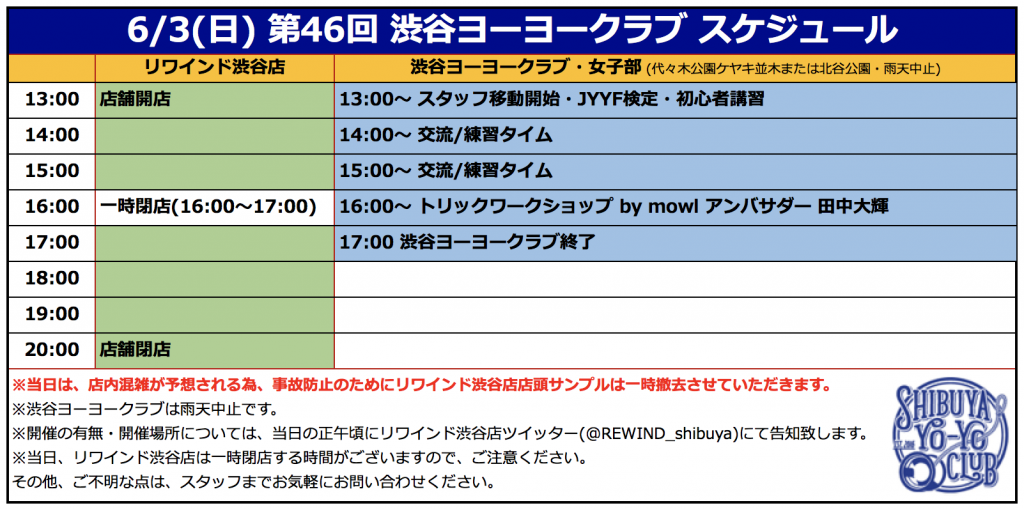 ※ヨーヨークラブ当日、16:00〜17:00の1時間、リワインド渋谷店は一時閉店となりますので、ご注意ください。また、本記事の最後に注意事項等もありますので、ご参加される方は、そちらもご確認ください。