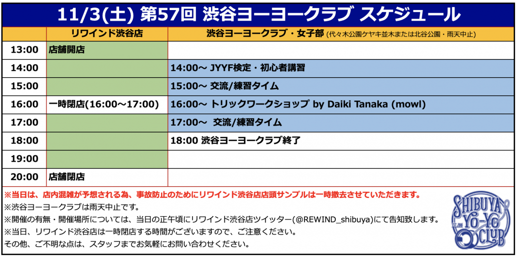 ※ヨーヨークラブ当日、16:00〜17:00の1時間、リワインド渋谷店は一時閉店となりますので、ご注意ください。本記事の最後に注意事項等もありますので、ご参加される方は、そちらもご確認ください。