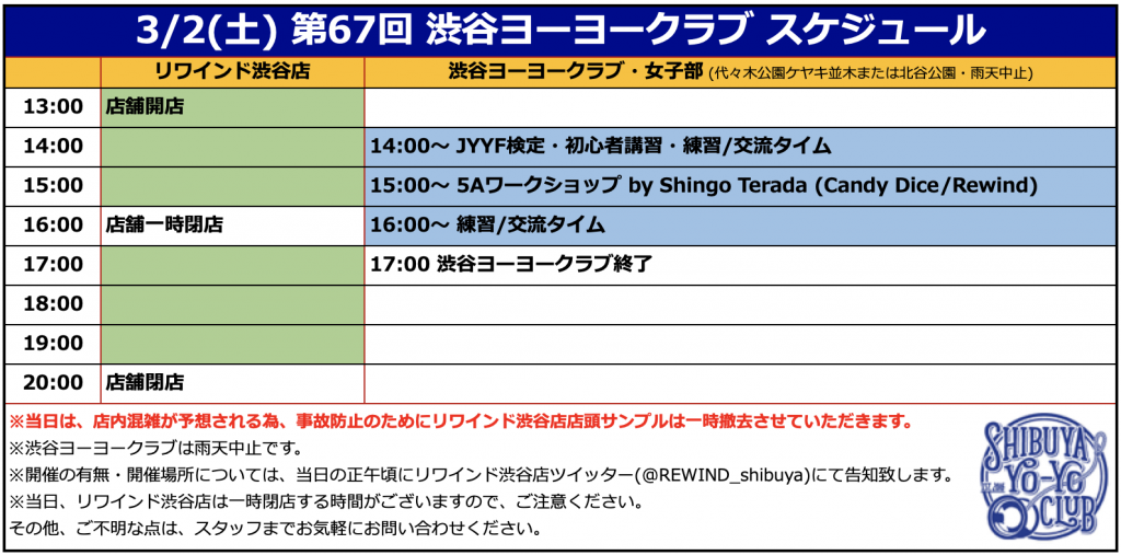 ※ヨーヨークラブ当日、16:00〜17:00の1時間、リワインド渋谷店は一時閉店となります。また、ヨーヨークラブ当日は、事故等防止のため、店頭サンプルを撤去させていただきます。ご了承ください。