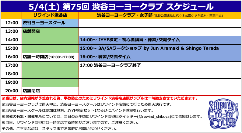 次回の渋谷ヨーヨークラブ・ヨーヨースクールは5月4日(土)に開催!