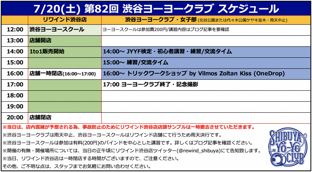 ※ヨーヨークラブ当日、16:00〜17:00の1時間、リワインド渋谷店は一時閉店となります。また、ヨーヨークラブ当日は、事故等防止のため、店頭サンプルを撤去させていただきます。