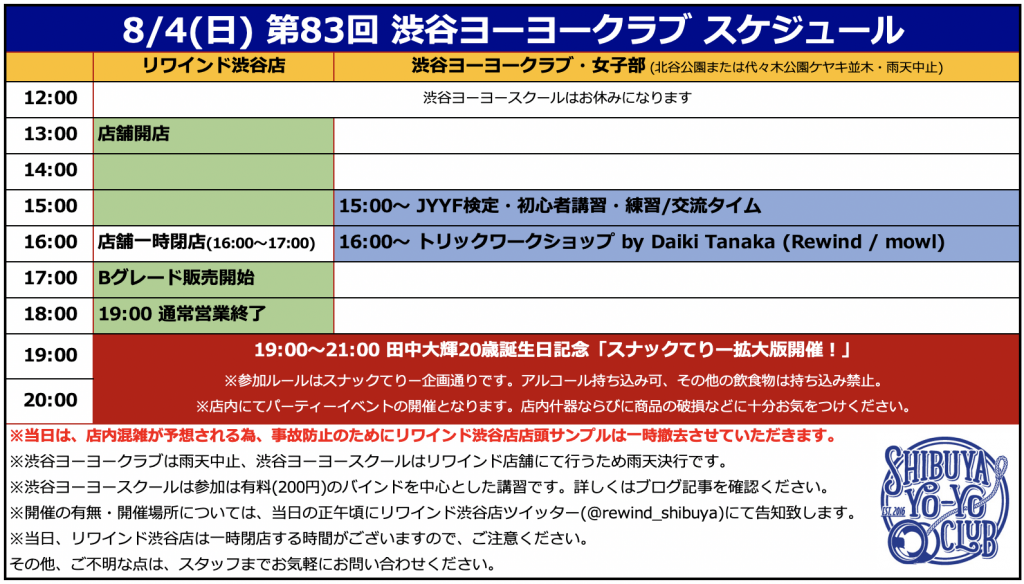 次回の渋谷ヨーヨークラブはスタッフ田中大輝の誕生日を記念し8月4日(日)に開催!