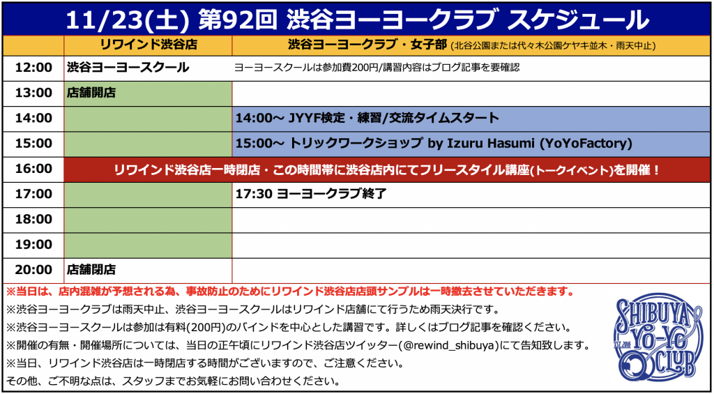 悪天候のため、第92回渋谷ヨーヨークラブは中止とさせていただきます。また、イヅルのフリースタイル講座は11/30(土)に延期とさせていただきます。ご迷惑をおかけいたしますが、ご理解のほど、よろしくお願いいたします。