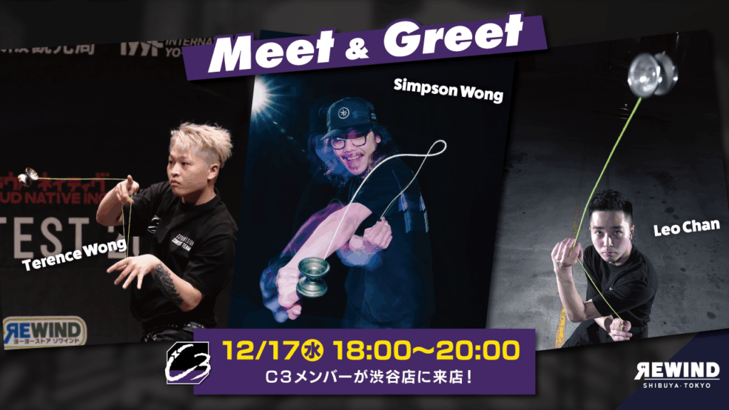 12月17日(水)18:00~20:00、リワインド渋谷店で開催。C3ヨーヨーデザインからメンバーが来店。交流イベント《Meet & Greet》を開催します!ジュニア大会先行販売アイテムも発売予定。詳しくはブログで。