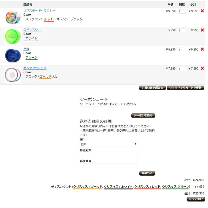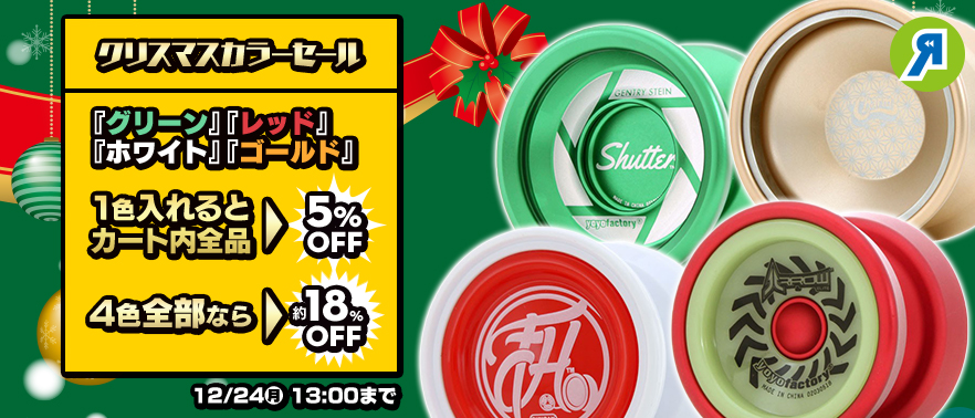 グリーン、レッド、ゴールド、ホワイトのヨーヨーをカートに入れると、カート内の商品が全品お得になります(5%OFFが4回されるので約18.5%ぐらいのOFFになります)