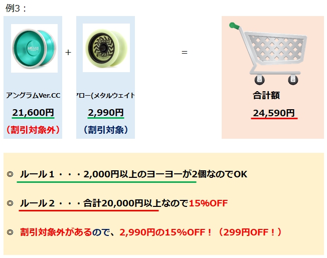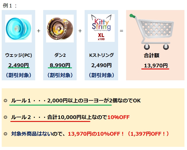 ※新商品、限定商品、セール商品、セット商品など、一部商品が割引対象外ですが、合計金額の対象にはなります(セット商品はヨーヨーとしてカウントされないため、合計金額の対象になりません)。割引対象外商品についてはこちら